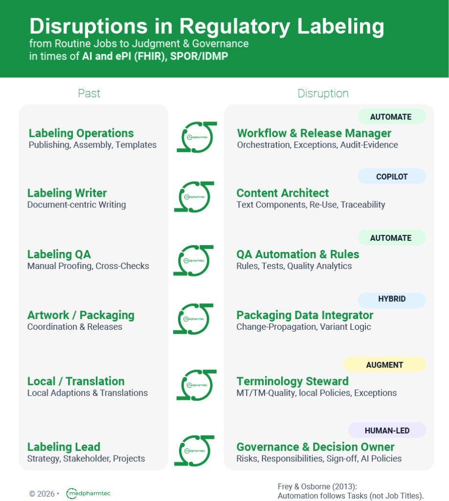 From document production to structured content, workflows, and governance Executive Summary Regulatory Labeling is not “being replaced by AI” — it is being rebalanced. A task-based view (Frey & Osborne, 2013) suggests that rule-based, repeatable work is automated first, while judgment, stakeholder coordination, and accountable sign-off remain human-led. In Regulatory Labeling, this shift is accelerated […]